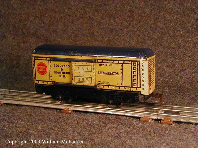 | 555 | refrigerator | Colorado & Southern | yellow/blue; black frame | opening doors; riveted couplers; blue door guides (1937-1952) | |||
