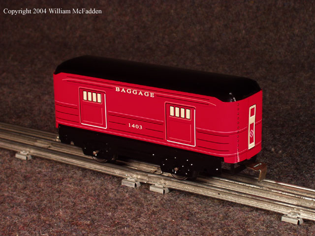 | 1403 | baggage car --custom-- | "Baggage" | red/black; black frame | FauxToys Railroad Wrap conversion of a Bogota coach; riveted couplers | |||