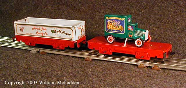 | (no number) | flat car --custom-- | red | custom 2003 Christmas car by Wayne Beachy with new-Marxtrains flat car and Schilling tin truck ornament load | ||||