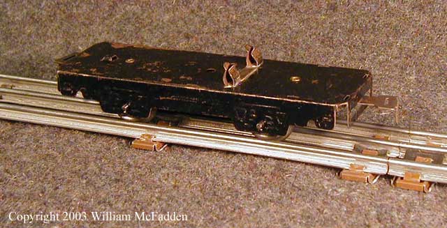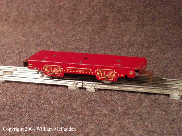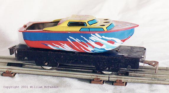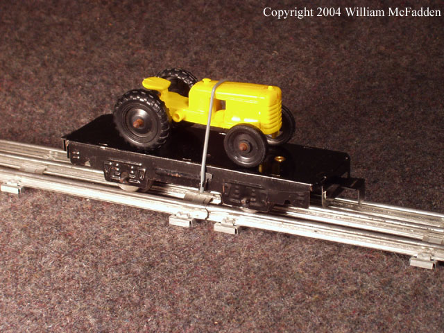| (no number) | flat car --custom-- | black | shown with tin-litho boat load & vintage plastic tractor of unknown provenance; I have several such flats made from otherwise un-restorable cars | ||||