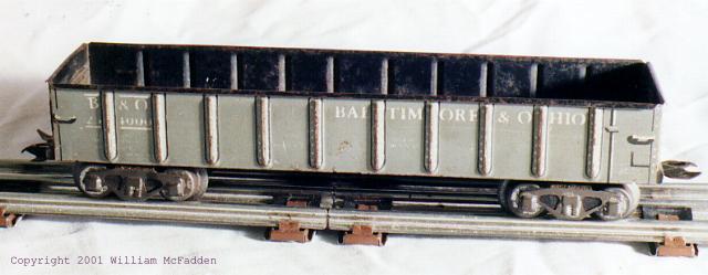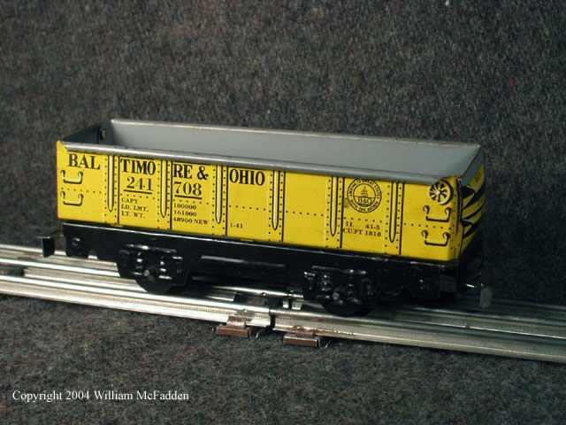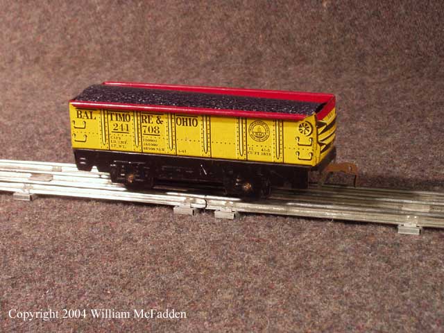| 241708 | gondola | Baltimore & Ohio | yellow/red; black frame | rolled ends; plastic wheels; sliding couplers; shown with non-original home-made coal load (1953-72) | |||