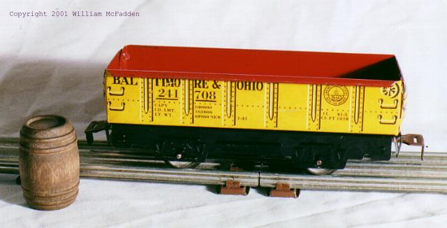 | 241708 | gondola | Baltimore & Ohio | yellow/red; black frame | rolled ends; sliding couplers; metal wheels might be replacements; shown with non-original load: oil barrel (1953-1972) | |||