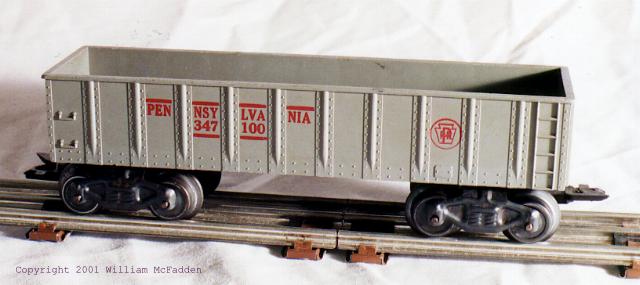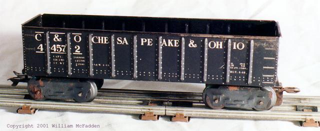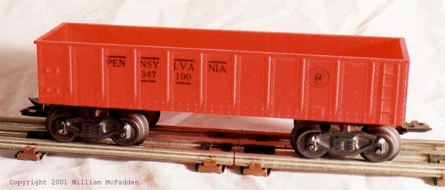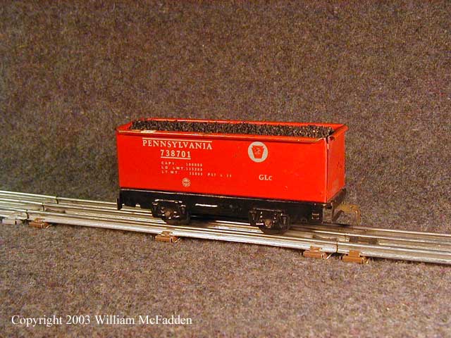 | 738701 | hi-side gondola | Pennsylvania | red; black frame | shown with non-original coal load; this car currently sports a "Faux Toys" C&O covered hopper wrap photo (1950-55) | |||