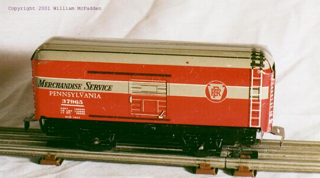 | 37965 | boxcar | Pennsylvania | red/grey; black frame | "Merchandise Service"; plastic wheels; sliding couplers (1954-55) | |||
