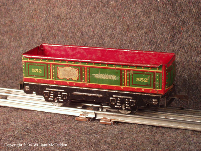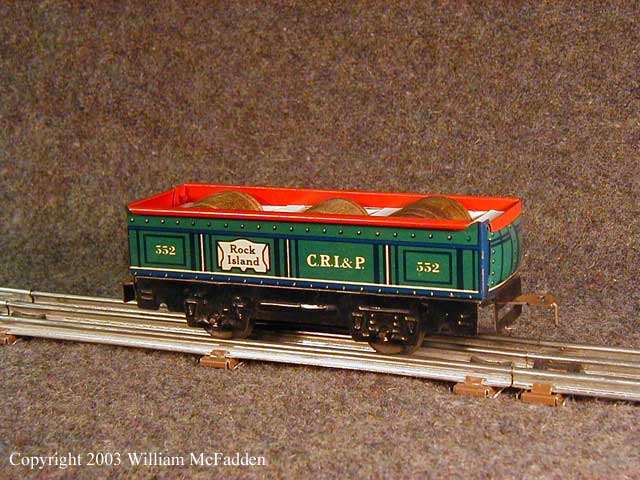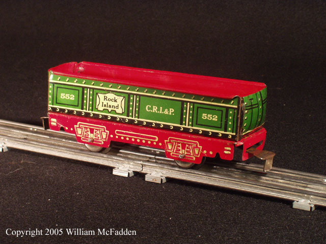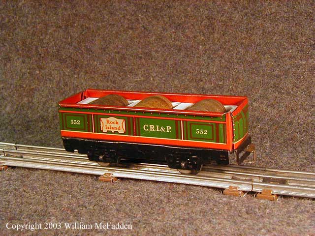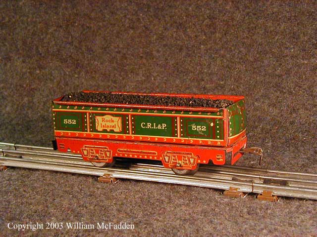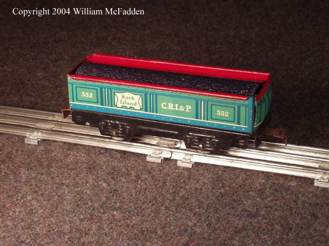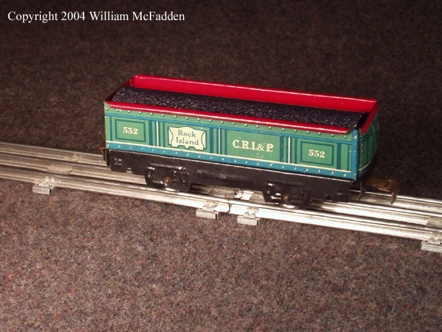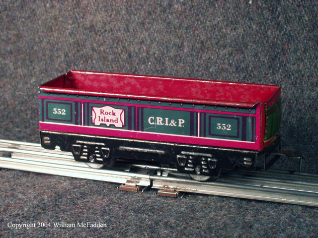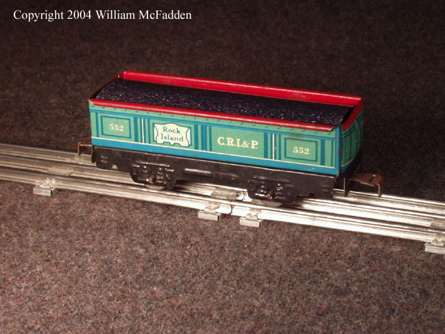 | 552 | gondola | Rock Island | green/blue; black frame | "C.R.I. & P."; rolled ends; riveted couplers; poorly stamped sideframes; shown with non-original home-made coal load (1946-52) | |||