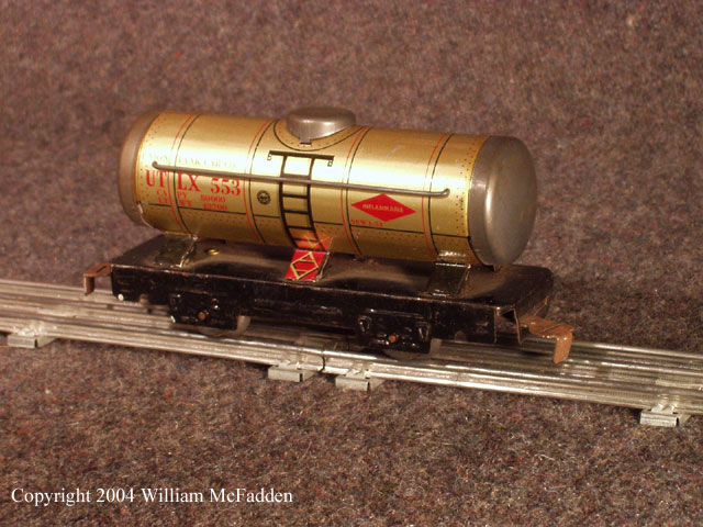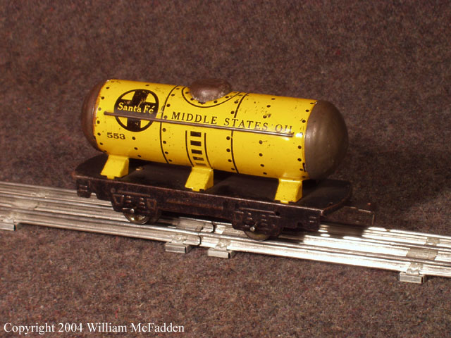 | 553 | tank | Santa Fe | yellow/black; black frame | "Middle States Oil"; riveted tab-and-slot couplers; replacement wheels & axles (1936-37) | ||