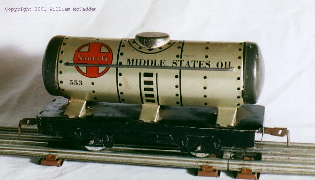 | 553 | tank | Santa Fe | silver; black frame | "Middle States Oil"; riveted couplers; tinned flat ends & dome (1939-52) | |||