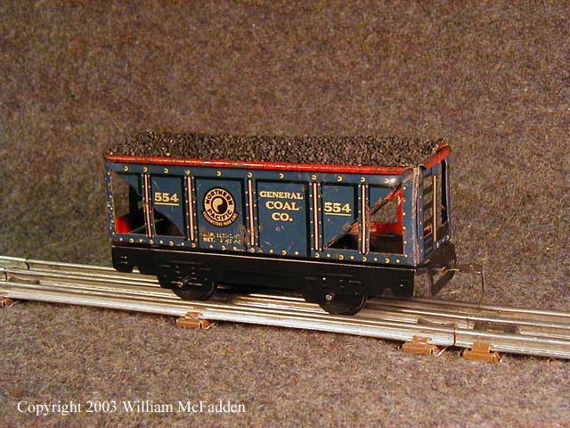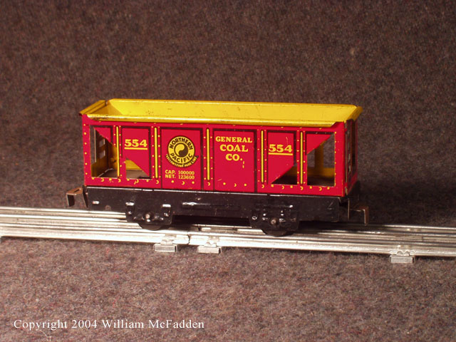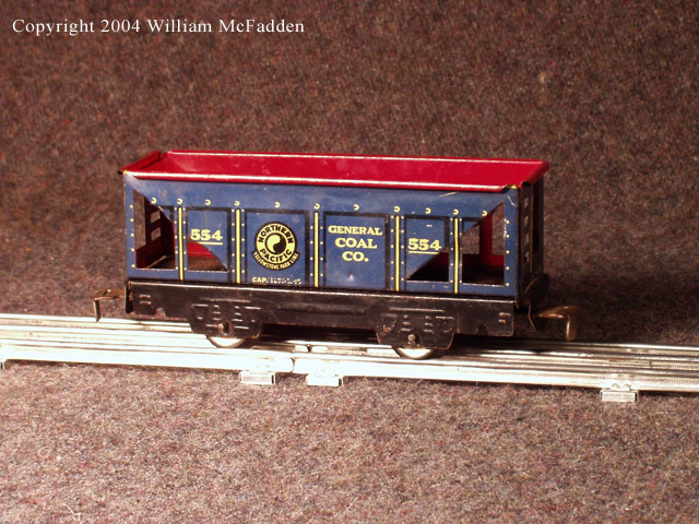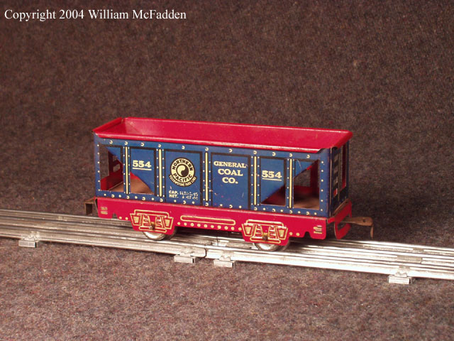 | 554A | hopper | Northern Pacific | blue/red; black frame | "General Coal Co."; plastic wheels might be replacements; riveted couplers; shown with non-original coal load (1937-42) | |||