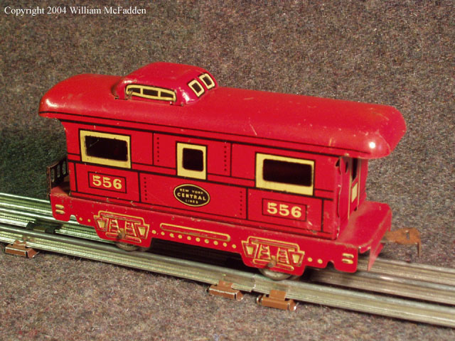 | 556 | caboose | New York Central | red/cream; black frame | riveted couplers; no logo on side; slot under doors; this car currently sports a "Faux Toys" PRR wrap photo (1937-42) | |||