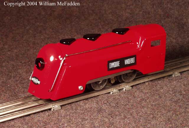 | (597) before after | steam locomotive --custom-- | red/black | COMMODORE VANDERBILT; 0-4-0; painted metal; pre-war motor; reverse; headlight; replacement handrails & nameplates; renovated/custom paint (1934-52) | |||
