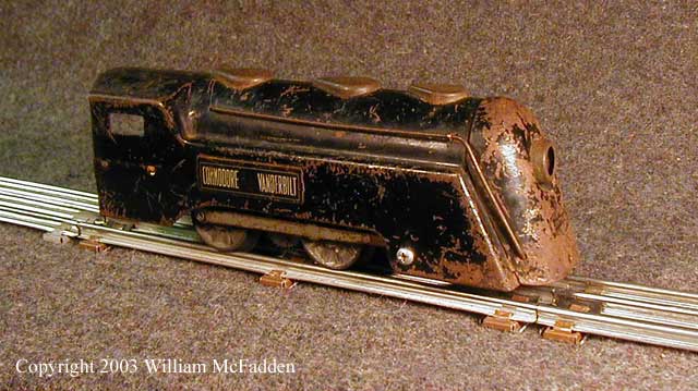 | (597) | steam locomotive | black | COMMODORE VANDERBILT; 0-4-0; painted metal; reverse; headlight; brass nameplates; visor over headlight; open stack (1934-52) | |||
