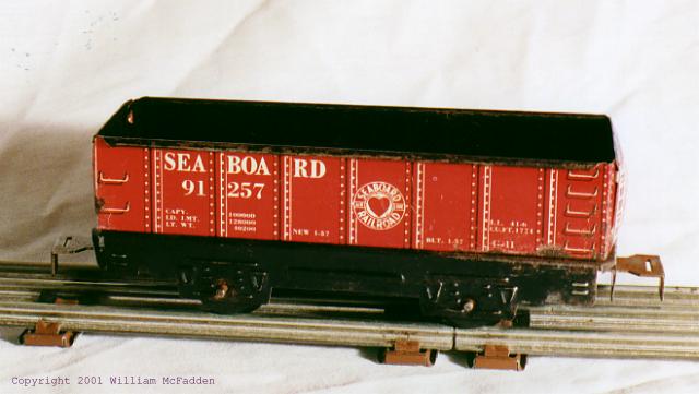 | 91257 | gondola | Seaboard | red/black; black frame | rolled ends; plastic wheels; sliding couplers (1958-72) | |||
