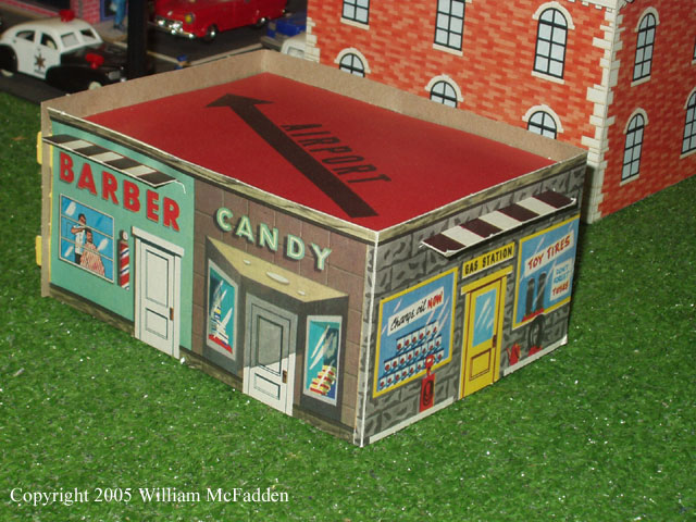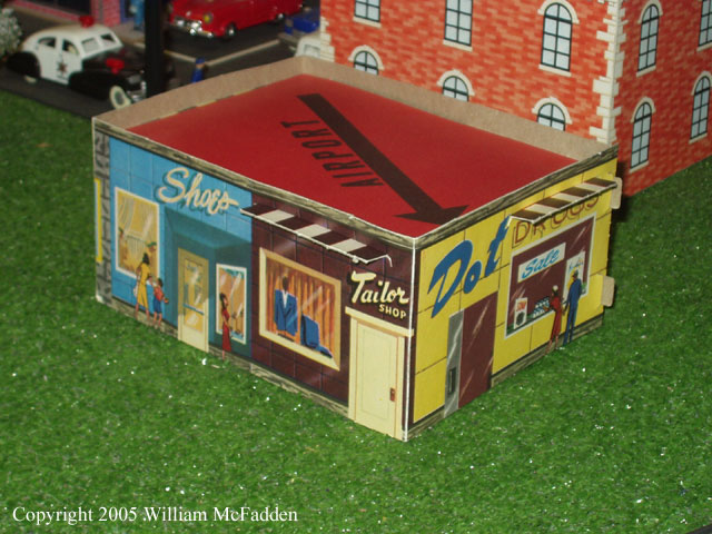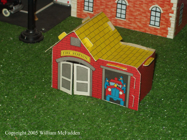 | 151 | 34 Piece Railroad and Village Construction Set | printed cardboard tab-and-slot buildings; I have two sets: a complete one and a partial one; this item was printed by Jaymar (220 5th Ave, NY) around 1950 and was included with many 4-wheel plastic sets. Research indicates that this item was also packaged with a wind-up set (plastic loco, 6"-tin rolling stock) offered by Montgomery-Wards in 1955. Photos: Shops, sides 1 & 2 | sides 3 & 4 | Firehouse | ||||